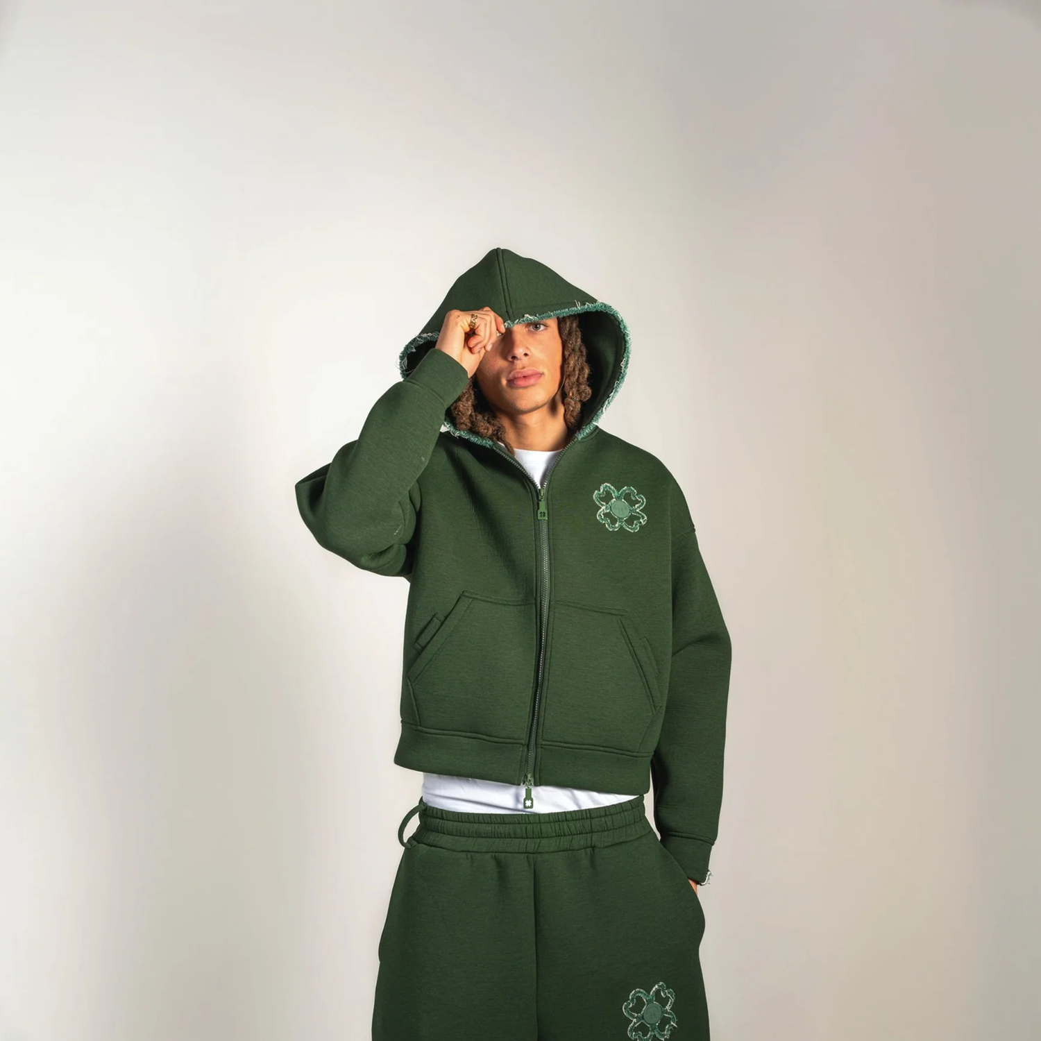 Den oversized pasform, de ikoniske kløverblade og den omhyggelige finish gør den til et moderne og sofistikeret stykke tøj, der er perfekt til en afslappet stil.