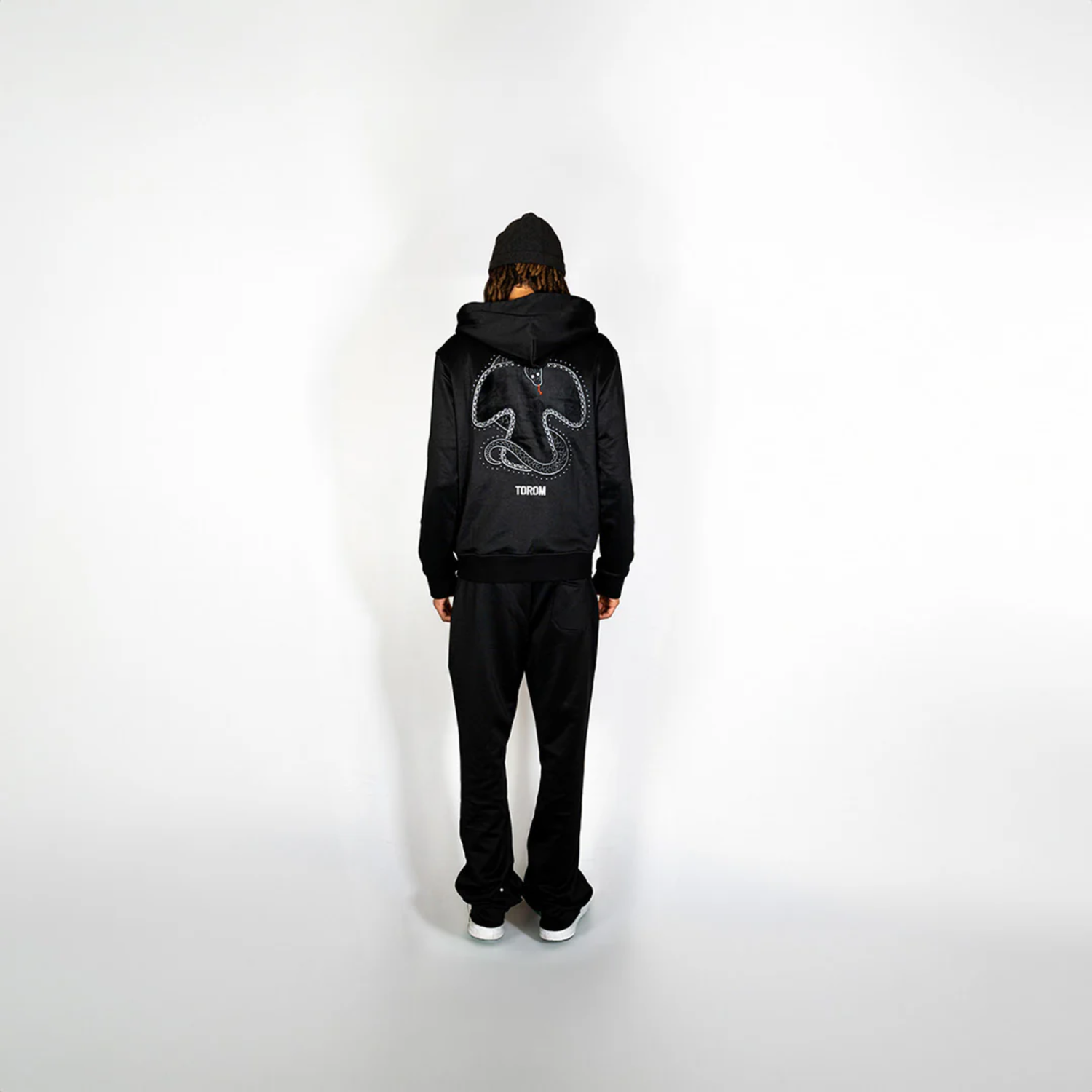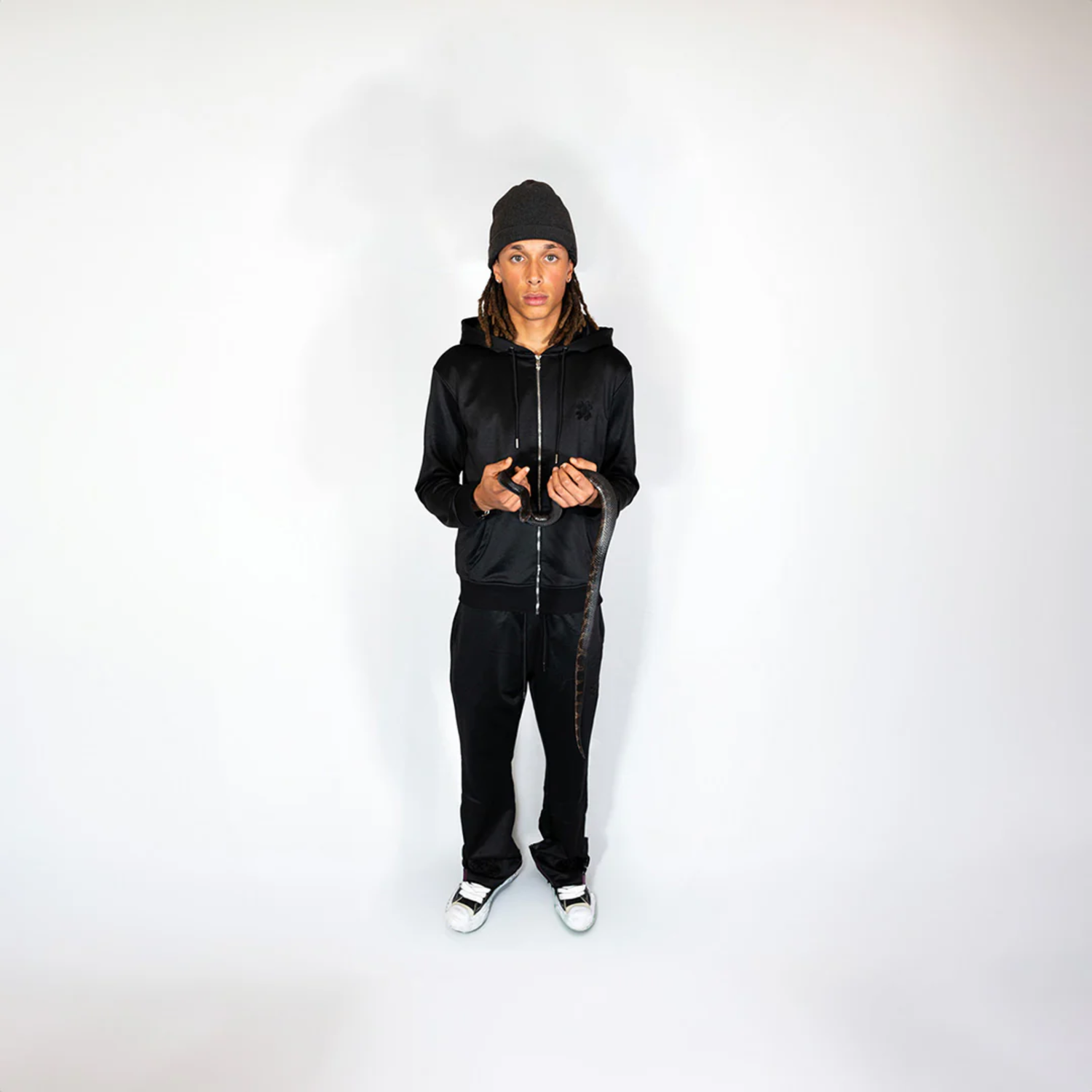 Joggingbukserne ›Jogging snake black‹ fra TOROM kombinerer diskret elegance med urban stil. Den rene hvide farve suppleres af subtilt integrerede kløverblad-logoer – for et design, der perfekt kombinerer komfort og raffinement. Et uundværligt stykke tøj for alle, der ønsker at se stilfulde ud hver dag.